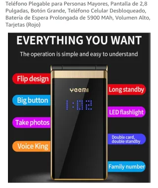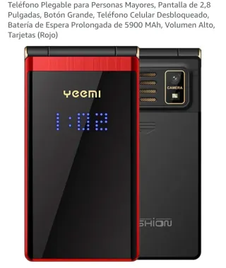 Teléfono móvil plegable YEEMI en color rojo y negro. Diseñado para personas mayores con botones grandes y pantalla de 2,8 pulgadas. - Botón grande para facilitar su uso. - Pantalla de 2,8 pulgadas. - Batería de larga duración de 5900 mAh. - Volumen alto para llamadas. Nuevo sin estrenar