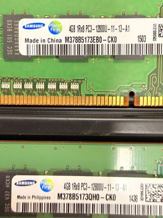 Especificaciones Técnicas: Capacidad total: 24GB (6 módulos de 4GB cada uno). Marca: Micron (Original). Modelo: MT36JSZF51272PZ. Tipo: DDR3 PC3-10600R (1333MHz). Formato: 2Rx4 (Registered DIMM). Latencia: CL9. Estado: En perfecto estado estético y funcional. ⚠️ NOTA IMPORTANTE DE COMPATIBILIDAD: Al ser memorias ECC Registered, están diseñadas para servidores (HP ProLiant, Dell PowerEdge, etc.) y workstations (Mac Pro 4,1/5,1, Lenovo ThinkStation, etc.). No son compatibles con placas base domésticas estándar (PC de escritorio normal). Por favor, asegúrate de que tu equipo las soporta.