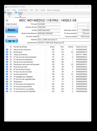 Estado y Detalles Técnicos: Capacidad: 14 TB (14.000,5 GB). Salud: "Bueno" en CrystalDiskInfo (puedes ver la captura en las fotos). Velocidad: 7200 RPM. Uso: 18.434 horas (𝐞𝐬𝐭𝐨𝐬 𝐝𝐢𝐬𝐜𝐨𝐬 𝐞𝐬𝐭á𝐧 𝐝𝐢𝐬𝐞ñ𝐚𝐝𝐨𝐬 𝐩𝐚𝐫𝐚 𝐝𝐮𝐫𝐚𝐫 𝐦á𝐬 𝐝𝐞 𝟏.𝟎𝟎𝟎.𝟎𝟎). Sectores: 0 sectores reasignados, 0 sectores pendientes (está perfecto). IDEAL PARA Synology (Perfecto para volúmenes SHR y RAID). Terramaster, QNAP y Asustor. Servidores Unraid, TrueNAS y ProxMox,Plex Media Server 💡 Por qué este disco: Tecnología CMR: no se ralentiza durante las reconstrucciones de RAID NO CAMBIOS NO SE ACEPTAN DEVOLUCIONES NO OFERTAS ABSURDAS
