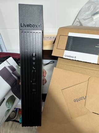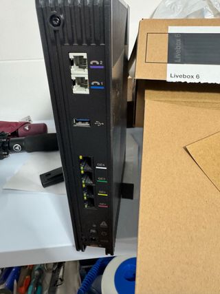 Router Livebox 6 de Orange, compatible con Movistar. - Puertos Ethernet Gigabit (GE1-GE4). - Puertos para teléfono (RJ11). - Puerto USB.