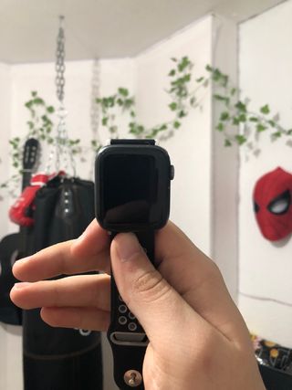 Reloj inteligente Apple Watch Series 6 en color gris espacial. - Caja de aluminio. - Pantalla Retina. - Correa deportiva negra con detalles en gris. No tiene caja solo cargador
