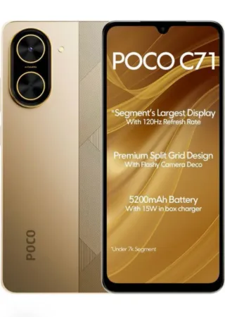 Teléfono móvil POCO C71 en color dorado y con 128GB de almacenamiento. - Pantalla grande con tasa de refresco de 120Hz. - Diseño con acabado dividido y detalles en la cámara. - Batería de 5200mAh. - Cargador de 15W incluido en la caja.
