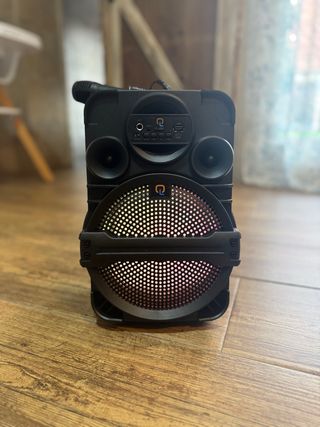 Altavoz portátil con un diseño moderno y llamativo. - Altavoces duales. - Panel de control superior. - Entrada para micrófono. - Luces LED multicolores.
