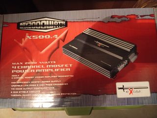Amplificador de potencia Excalibur X500.4. negro/plata. Totalmente nuevo en su caja, ni lo llegué a abrir, se confundieron en el envío, me enviaron otro modelo y no vinieron a recogerlo. - Potencia máxima de 2000 Watts. - 4 canales MOSFET. - Fuente de alimentación MOSFET de alta eficiencia. - Crossover variable de paso bajo y paso alto. - Configuraciones de salida Tri-Mode. - Circuitos estables de 2 Ohm. - Protección térmica/cortocircuito/sobrecarga.
