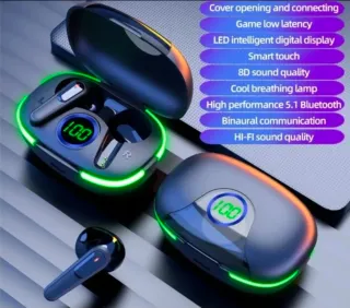 Auriculares inalámbricos con un diseño moderno y elegante. - Conexión automática. - Pantalla digital LED inteligente. - Calidad de sonido 8D. - Luz LED - Bluetooth 5.1 de alto rendimiento. Nuevos aún con la pegatina y todo. Viene con manual y cable de carga