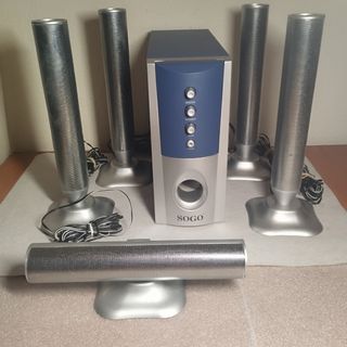Home Cinema SOGO SS-9 SPKR - Sistema: 5.1 - Altavoces satélite: 5 unidades. - Subwoofer: 1 unidad. - Controles: Volumen, graves, reales. - Conectividad: RCA (analógica, por cable). - Potencia total: 30-60W RMS (aprox.). - Uso: Cine en casa, música, juegos..... - ESTADO: En la parte trasera del Subwoofer dañadas dos esquinas superiores ( ver imágenes) , por lo demás normal con señales de uso.