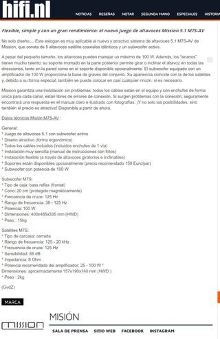 Conjunto 5.1 Mission M7S compuesto por 5 altavoces + subwoofer. Se compraron en su día por una oferta en pack de un amplificador Cambridge Audio + Mission y no se estrenaron. Siguen en su caja SIN desprecintar. PVP de estos M7S en su momento eran 749€. Por el precio de una barra de sonido de gama baja con sonido envolvente simulado, te llevas un 5.1 de verdad. Especificaciones en última foto. Fotos sacadas de internet, el set que vendo está en su caja SIN desprecintar. NO envío.