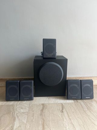 Sistema de cine en casa Trust 4000P 5.1 en buen estado. - Sistema de sonido envolvente 5.1. - Controles de volumen individuales para cada canal (frontal, trasero, central, bajos). - Control de volumen maestro. - Conector de entrada de audio.