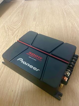 Etapa de potencia Pioneer con una potencia máxima de 500W. Modelo GM-A3702. - Diseño en color negro con detalles en rojo. - Ideal para sistemas de audio de coche.