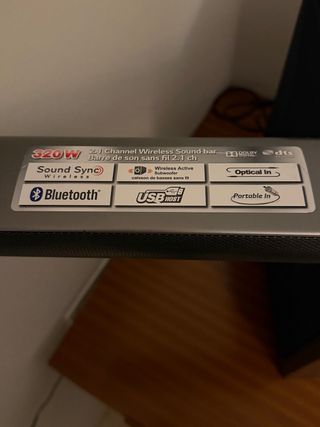 Barra de sonido LG con subwoofer inalámbrico activo. - 320W de potencia. - Sistema 2.1 canales. - Conexión Sound Sync Wireless. - Bluetooth. - USB Host. - Entrada óptica. - Entrada portátil.