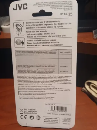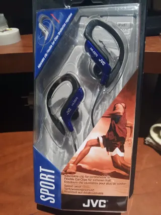 Auriculares deportivos JVC HA-EB75, diseñados para el deporte y la actividad física. - Clip ajustable y flexible para un ajuste cómodo. - Resistentes a salpicaduras de agua. - Ideales para usar durante el ejercicio.