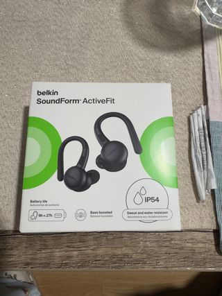 Auriculares inalámbricos Belkin SoundForm ActiveFit en color negro. Diseñados para un ajuste seguro y cómodo durante la actividad física. - Resistencia al sudor y salpicaduras (IP54). - Sonido con graves realzados. - Autonomía de hasta 9 horas de reproducción, más 27 horas adicionales con el estuche de carga. están nuevos sin abrir, con el precinto
