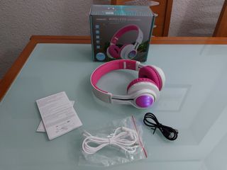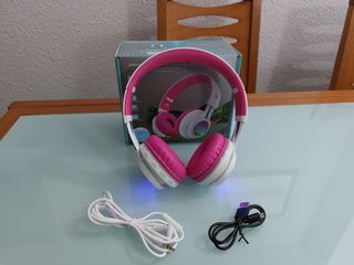 Auriculares inalámbricos para niños, con luces LED de colores que pueden activarse y desactivarse. Se pueden utilizar de forma inalámbrica o con cable. Se incluyen cable de carga, cable de conexión, instrucciones y caja. Funcionan muy bien. Se pueden plegar. Diadema ajustable. No hago envíos.