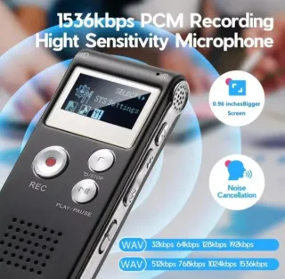Grabadora de voz compacta con capacidad de 8GB y función de activación por voz - Diseño elegante en negro y plateado ⁃ Pantalla TFY de 0.96" para navegación ⁃ Line In para Micrófono y Out para auriculares. Ambas en Jack 3.5mm ⁃ Botones de control de grabación y reproducción - Botones de Volumen y de encendifo y apagado - Micrófono Sensible ajustable a 5 modos de decibelios de entrada - Grava en formato Wav (512Kbps - Cancelación de Ruida ⁃ Perfecto para entrevistas, clases, tomar notas en el coche, y también sirve como reproductor MP3 y Wav. - Monitoreo, Control de Voz, Grabación Temporizada - Hasta 50h aprx Dimensiones: 85x36x14