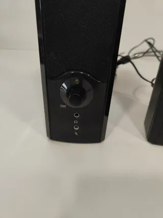 Par de altavoces amplificados con un diseño moderno. - Controles de volumen, tono y potencia. - Entrada de audio de 3.5mm. - Adaptador de corriente incluido.