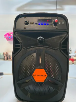 LEER : Altavoz amplificado mediano potente con diseño moderno y llamativo. ( Tiene una pequeña roptura parte de arriba que no afecta para nada a su funcionamiento ) La bateria no dura mucho pero ¡¡ si te llevas una bateria externa y lo dejas cargando el altavoz tienes musica con sonido potente, impresionante por horas !!! - blutud. - Puerto USB - Entrada MIC IN - Entrada LINE IN - Pantalla digital MP3 - Control de volumen - Indicador LED - luces.