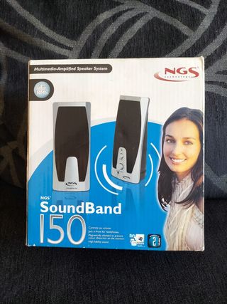 Sistema de altavoces multimedia amplificado NGS SoundBand 150. Muy poco uso. - 4w RMS. - Controles de encendido y volumen. - Conector para auriculares en la parte frontal. - Blindaje magnético para evitar distorsión de color en el monitor. - Sonido de alta fidelidad.