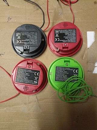 Los 4 altavoces por 4€. Diámetro 8 cm. Llevan 3 pilas para amplificar Con instrucciones.