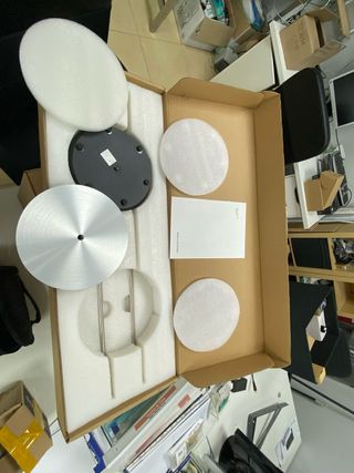 Soporte de suelo original para altavoces Bang & Olufsen BeoLab 14. Diseñado para complementar tu sistema de sonido. - Base circular de color negro. - Disco superior de aluminio pulido. - Incluye piezas de espuma protectora.
