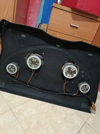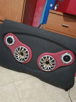 Bandeja para coche con altavoces integrados. Diseñada para añadir sonido a tu vehículo con calidad. -Bandeja con acabado en tela. -Dos medios y 2 tweeter beyma con conectores rápido. -Detalles en color rojo.