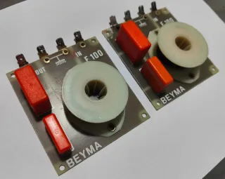 Se venden dos filtros Beyma F100. Son filtros pasivos para agudos lo que significa que no requieren alimentación externa. Su función es dividir la señal de audio en diferentes rangos de frecuencia (altas y bajas) para enviarlas a los altavoces adecuados. Tienen una pendiente de 12 dB/octava y una atenuación de alta frecuencia de 0, -3 dB. Son compatibles con impedancias de baja frecuencia de 4-8 Ohms y de alta frecuencia de 8 Ohms. La potencia admisible es de 600 W RMS. Negociable!