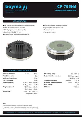 Tweeter Beyma CP 12. - Tweeter de compresión. - Bobina de voz de 44,4 mm. - Imán de ferrita.