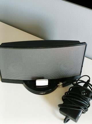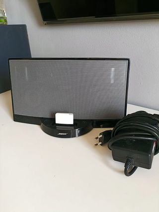 Altavoz Bose en color negro SoundDock. Cargador original, mando a distancia y adaptadores. Adaptador para conexión bluetooth No suena aunque le llega electricidad.