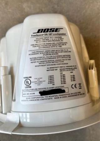 Altavoz de la marca Bose, modelo DM2S. Especificaciones Respuesta de frecuencia (+/-3 dB) 95- 17,000 Hz Cobertura nominal (horizontal x vertical) 170° x 170° Manejo de potencia, pico 64 W SPL máximo a 1 m 96 dB Rango de frecuencia (-10 dB) 80-19,000 Hz Manejo de potencia, continuo a largo plazo 16 W Sensibilidad (SPL/1 W a 1 m) 84 dB Impedancia nominal 16 Q (derivación del transformador) - Color blanco. - Diseño compacto y moderno.