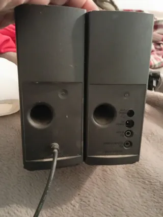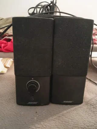 Altavoces Bose para PC en muy buen estado y funcionamiento perfecto. Sonido potente y claro. Control de volumen frontal y salida para auriculares. Sin caja, con cables. Uno de los altavoces tiene una pequeña hendidura pero que no afecta a su funcionamiento
