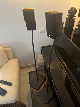 Sistema de altavoces Bose en color negro, ideal para complementar tu equipo de sonido. Incluye 2 altavozes soportes para colocarlos a la altura conectados a 1 subwoofer bose conectados a amplificador de sonido pioneer. - Diseño elegante y moderno. - Acabado en negro mate. - Soportes de suelo incluidos.