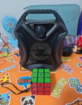 Un par de altavoces, uno grande y otro pequeño con forma de cubo de rubik. El grande tiene luces y funciona mediante pilas o cable. El pequeño solo por cable. El grande incluye USB, AUX y TF. El pequeño AUX. Se alimentan con clavija antigua, con base plana y la parte de arriba "triangular". El grande viene con cable original, pero sirve para los dos. No viene con cabezal.