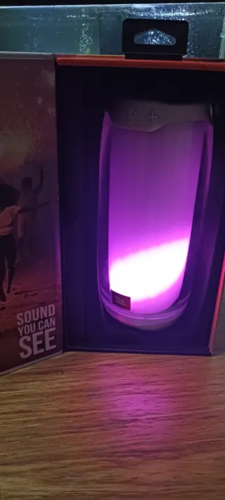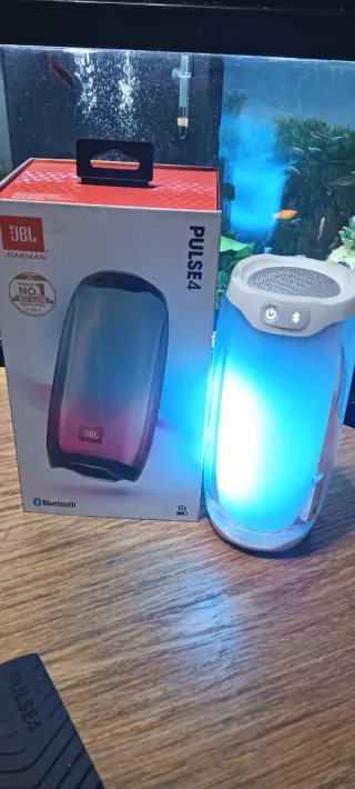 Altavoz portátil JBL Pulse 4 en color azul y blanco. Ofrece una experiencia de sonido y luz inmersiva. - Diseño cilíndrico con iluminación LED. - Conexión Bluetooth. - Resistente al agua. En su estuche original