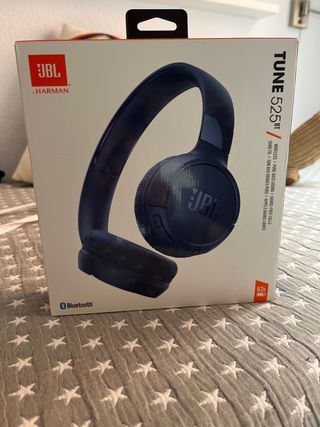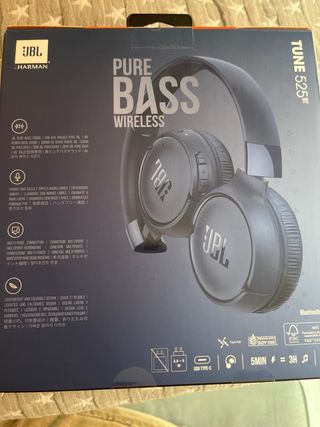 Auriculares inalámbricos JBL TUNE 525BT en color azul marino. Han sido usados una sola vez. Los vendo por que no me son cómodos y no los puedo devolver por el desperfecto en la caja ( penultima foto) También tienen un pequeño desperfecto en la parte superior (ultima foto) - Conexión Bluetooth. - Sonido Pure Bass. - Llamadas manos libres. - Hasta 57 horas de autonomía.