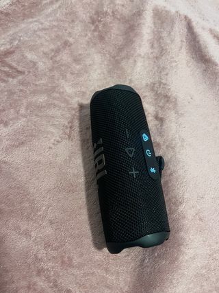 Altavoz portátil JBL Flip 5 en color negro. Se encuentra en perfecto estado. - Diseño cilíndrico. - Logotipo de JBL en la parte frontal.