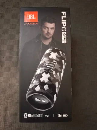 Altavoz portátil JBL Flip 6, edición especial Martín Garrix. Diseñado para ofrecer un sonido potente y claro. - Diseño con estampado de camuflaje en blanco y negro. - Conexión Bluetooth v5.1. - Hasta 12 horas de reproducción.