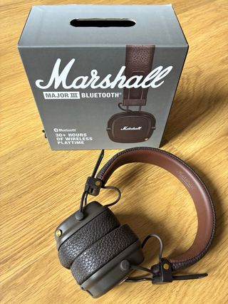 Auriculares Marshall Major III totalmente nuevos. Son marrones con efecto cuero. Se entregan en su caja, precintada. Me regalaron dos iguales. - Bluetooth: más de 30 horas de reproducción inalámbrica - Sonido emblemático: drivers personalizados de 40 mm para graves mejorados, medios suaves y agudos claros - Rediseñado: almohadillas aerodinámicas + bisagras estilizadas + diadema de ajuste recto + cable de lazo grueso con amortiguadores de goma reforzados - Control remoto de un botón con micrófono: controle sus auriculares y el teléfono con el control remoto de un botón con micrófono