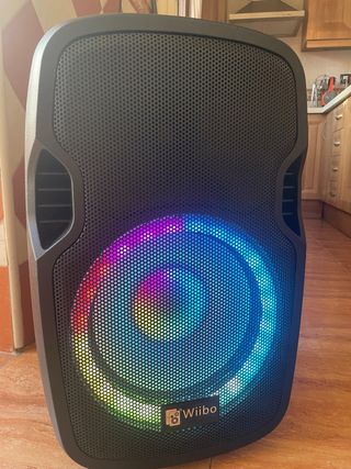 Preciosa bocina portátil Wiibo, en perfecto estado. Es negra con luces multicolor. - Dispone de reproductor USB/SD. - Incluye control de volumen, bajos y agudos. - Conexión para micrófono y línea de entrada/salida. -tiene todas las entradas que sale en la foto - tiene radio y esta nuevo a sido poco usado .incluye soporte en perfecto estado
