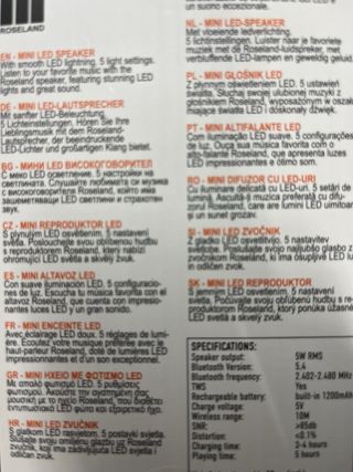 Altavoz portátil Roseland con iluminación LED. - Potencia de 5 vatios RMS. - Autonomía de 5 horas de reproducción. - Tiempo de carga de 3 a 4 horas. - 5 configuraciones de luz diferentes.