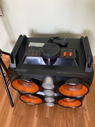 Altavoz FENTON MDJ200 PARTY STATION - Amplificador 150w, Batería interna para 3h a 5h. Reproductor USB/SD/Bluetooth y entrada aux. Altavoces iluminados con LEDs RGB (on/off) Pantalla LCD con información del MP3 2 entradas micro (Jack 6.3mm ) Echo para micros
