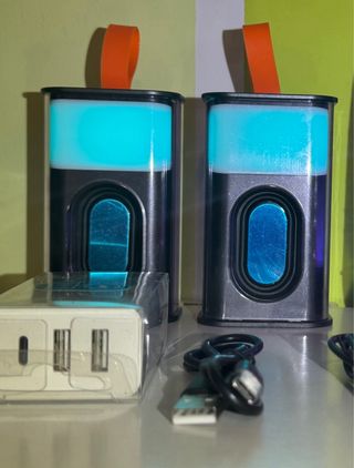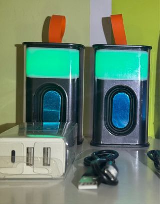 Lote de 2 Altavoces portátiles bluetooth con iluminación LED. - Correa de transporte naranja. - Cambia de color automatico o bien manual. - Admite llamadas. - Gran potencia de sonido. - Incluye 2 cables de carga tipo C - Adaptador triple se 5v 3A de carga rapida nuevo a estrenar sin abrir del leroy merlyn. 📦 El precio es por todo el lote. 🆕 Nuevo a estrenar. ✅ Estado del producto 10/10. ⏱️ Envío en 24h. 📩 Cualquier duda escríbeme. 👀 Más artículos relacionados en el perfil.