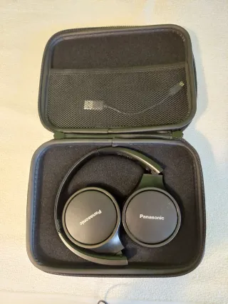 Cascos portátiles Bluetooth Panasonic con su funda protectora y cable de carga. - Diseño plegable. - Incluye funda de transporte. - Cable de carga USB. El cuero falso de las almohadillas se empieza a pelar por el tiempo que tienen, fotos adjuntas de ello