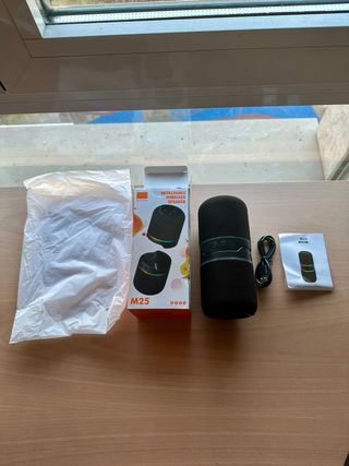 Altavoz portátil con doble función compatible con Bluetooth. - Modelo M25. - Diseño cilíndrico con acabado en tela. - Incluye cable de carga USB. - Manual de usuario. Se puede separa en dos cachos para tenerlo mas stereo o escuchar lo mismo en dos habitaciones. Cada jno tiene su carga y controles independientes pero se conectan entre sí por bluetooth y el dispositivo que emite la señal.