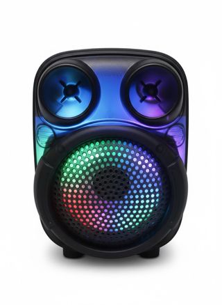 Altavoz portátil con potente sonido y luces RGB. - Conexión Bluetooth 5.3. - Reproducción vía USB, Tarjeta TF y Line In. - Función TWS para emparejar dos altavoces. - Resistente al agua. - Autonomía de 5 horas.