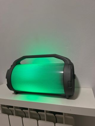 Se vende altavoz bluetooth portátil. Es un altavoz en color gris con luces de colores - Dispone de asa para facilitar su transporte. - Perfecto para llevar a cualquier parte.