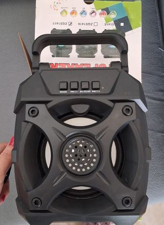 ¡Hola! Pongo a la venta este altavoz Dynasonic E-025, un equipo de karaoke portátil en color rosa y multicolor. Está en muy buen estado. - Dispone de Bluetooth, entrada auxiliar y ranura para tarjeta SD. - Incluye micrófono y mando a distancia. - Batería recargable con carga rápida tipo C. - Altavoces de 4 pulgadas. - Potencia de salida: 40W.