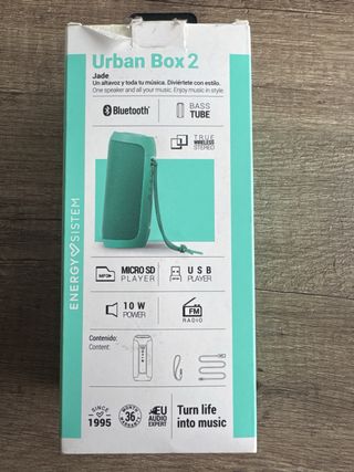 Altavoz portátil Energy Sistem Urban Box 2 en color azul verdoso. - Altavoz Bluetooth. - Radio FM. - Entrada USB. - Potencia de 10W.