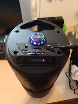Altavoz portátil con conexión Bluetooth. - Diseño moderno y compacto. - Fácil de transportar. - 10 W. REPARADO POR MI: NO TIENE BATERIA, SOLO FUNCIONA CON CARGADOR QUE SE ENTREGA. TIENE SUSTITUIDO EL PUERTO DE CARGA MINI USB POR CLAVIJA JACK. FUNCIONA: LUCES, SINTONIZADOR DE RADIO CON 28 PRESINTONIAS, ENTRADA LINE AUXILIAR, FUNCION BLUETOOTH, ENTRADA USB, LECTOR DE TARJETAS MICROSD. NO HE PODIDO COMPROBAR LA ENTRADA MIC