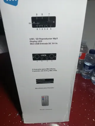 Altavoz portátil con reproductor MP3 integrado. - Reproduce música desde USB y tarjetas SD. - Pantalla LED. - Entrada Mini USB DC 5V. - Dos entradas para micrófono. - Controles de ECO y volumen de micrófono. - Incluye micrófono para karaoke. - Mando a distancia.