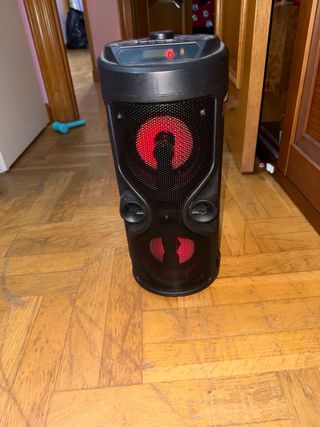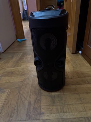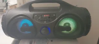 Altavoz portátil potente con luces led de colores. Ideal para llevar tu música a todas partes. Entrada de USB (para conectar un pendrive con música), Tarjeta SD y Jack para conectar por cable. Completamente nuevo sin estrenar. Lo vendo porque me lo han regalado y ya tengo otro. La caja sigue aún con el plástico del precinto.