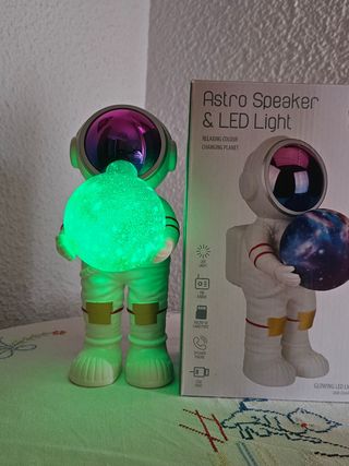 Altavoz con diseño de astronauta que también funciona como lámpara LED. - Altavoz Bluetooth - Luz LED de color cambiante - Puerto Micro SD - Puerto USB - Radio FM - Función de teléfono manos libres